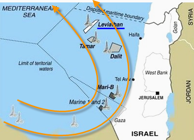 Σχετικά πρόσφατα, το Ισραήλ ανακοίνωσε την ανακάλυψη μεγάλου κοιτάσματος φυσικού αερίου σε βάθος 5 χιλιομέτρων από την επιφάνεια της θάλασσας με το όνομα Λεβιάθαν. Οι έρευνες έγιναν και με τεχνικά προκληθέντα σεισμικά γεγονότα. Η εξόρυξη φυσικού αερίου αναμένεται να αρχίσει μετά από 5-6 χρόνια και γίνεται προσπάθεια να αρχίσει το ταχύτερο. Το ποσοστό κέρδους για το Ισραήλ είναι το λιγότερο 45%.Η θέση του κοιτάσματος Λεβιάθαν, όπως και τών άλλων κοιτασμάτων στο χάρτη άνω δεξιά επιβεβαιώνουν όσα έχω αναφέρει παλαιότερα σχετικά με τη θέση σημαντικών κοιτασμάτων στη Μεσόγειο. Ειδικότερα αποδεικνύεται, ότι όσο πλησιάζουν οι έρευνες για φυσικό αέριο την περιοχή 7, το μέγεθος τών κοιτασμάτων αυξάνεται δραματικά.
