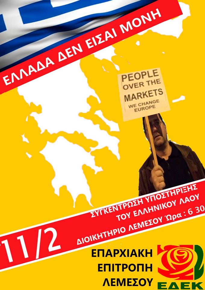 Την ώρα που η Ελλάδα θα δίνει τη μάχη για την αξιοπρέπεια της αλλά και για τη σωτηρία όλων των λαών της Ευρώπης μετά από πρωτοβουλία της επαρχιακής επιτροπής Λεμεσού, οι Κύπριοι θα στείλουν το δικό τους μήνυμα, που ελπίζουμε να κάνει το γύρο του κόσμου, κάτι αντίστοιχο που έγινε και πριν από λίγες μέρες έξω από την Ελληνική Βουλή