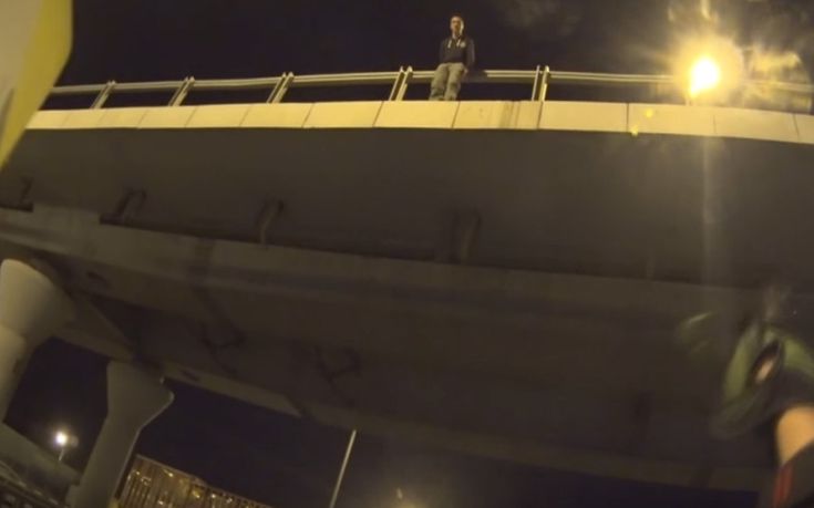 Από την κάμερα καταγράφηκαν οι αγωνιώδεις προσπάθειες του μοτοσικλετιστή να μεταπείσει τον άνδρα κάτι που τελικά καταφέρνει, ενώ για να βεβαιωθεί πως ο νεαρός θα είναι ασφαλής, ανέβηκε και ο ίδιος στη γέφυρα.