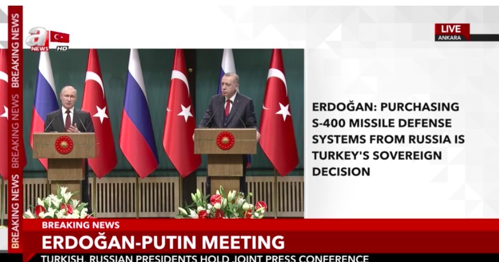 Ο Ρ.Τ.Ερντογάν ζήτησε επίσπευση παράδοσης των S-400 στην Τουρκία. Το σενάριο που παίζει έντονα τις τελευταίες ώρες είναι η παράδοση ενός συστήματος από την Συρία εδώ και τώρα. Οι Ρώσοι είχαν μεταφέρει τους τελευταίους μήνες αρκετά συστήματα S-400 και S-300/350 στην Συρία συνεπώς μπορεί να διατεθεί ένα τώρα.